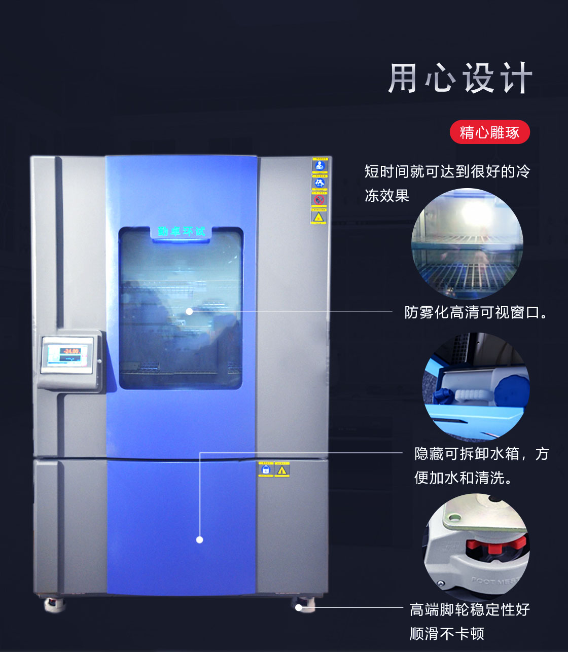 試驗箱結構設計先進合理,配套產品和功能元器件具有國際先進水平,能夠適 應長期、穩定、安全、可靠的生產需求。能夠滿足用戶為從事上述用途的加工生產要 求,且使用、操作、維修方便,使用壽命長,造型美觀,有良好的用戶界面,使用戶的操作和監測都更加簡單和直觀。