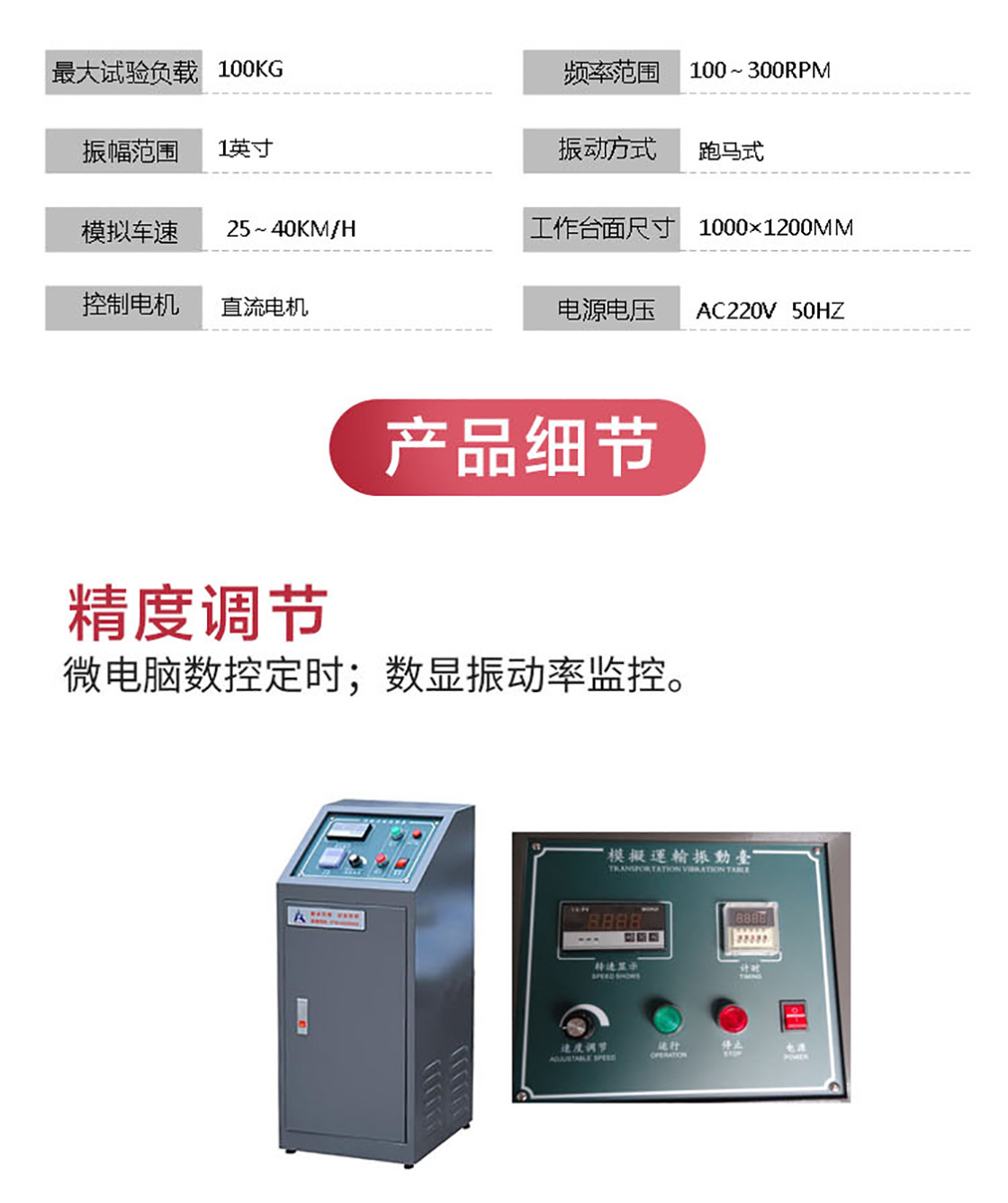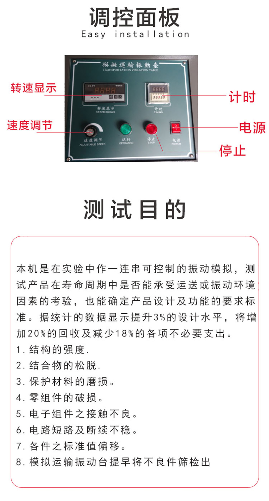 模擬運(yùn)輸振動試驗臺適用于玩具、電子、家具、禮品、陶瓷、通訊、器材、計算機(jī)及汽車零件的震動試驗等,用來視察其耐運(yùn)輸效果或耐久性均勻。數(shù)字儀表顯示振動頻率;同步靜噪皮帶傳動比;試品裝夾采用導(dǎo)軌式,操作方便、安全;機(jī)臺底座采用重型槽鋼配減振膠墊,安裝方便,運(yùn)行平穩(wěn),無需安裝地腳螺絲;直流電機(jī)調(diào)速,運(yùn)行平穩(wěn),負(fù)載能力強(qiáng)。