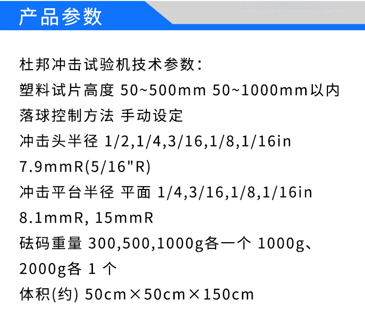 本機適用于塑料、陶瓷、壓克力、玻璃纖維等材料及試驗涂料之堅牢程度·原理:本儀器以規定重量之鋼球,調整在一定的高度,使之自由落下,打擊試樣,視其受損程度。杜邦沖擊試驗機依據標準符合 JIS-K5600(涂料)、ASTM-D2794、JIS-K5400等標準要求。塑料試片高度 50~500mm 50~1000mm以內落球控制方法 手動設定沖擊頭半徑 1/2,1