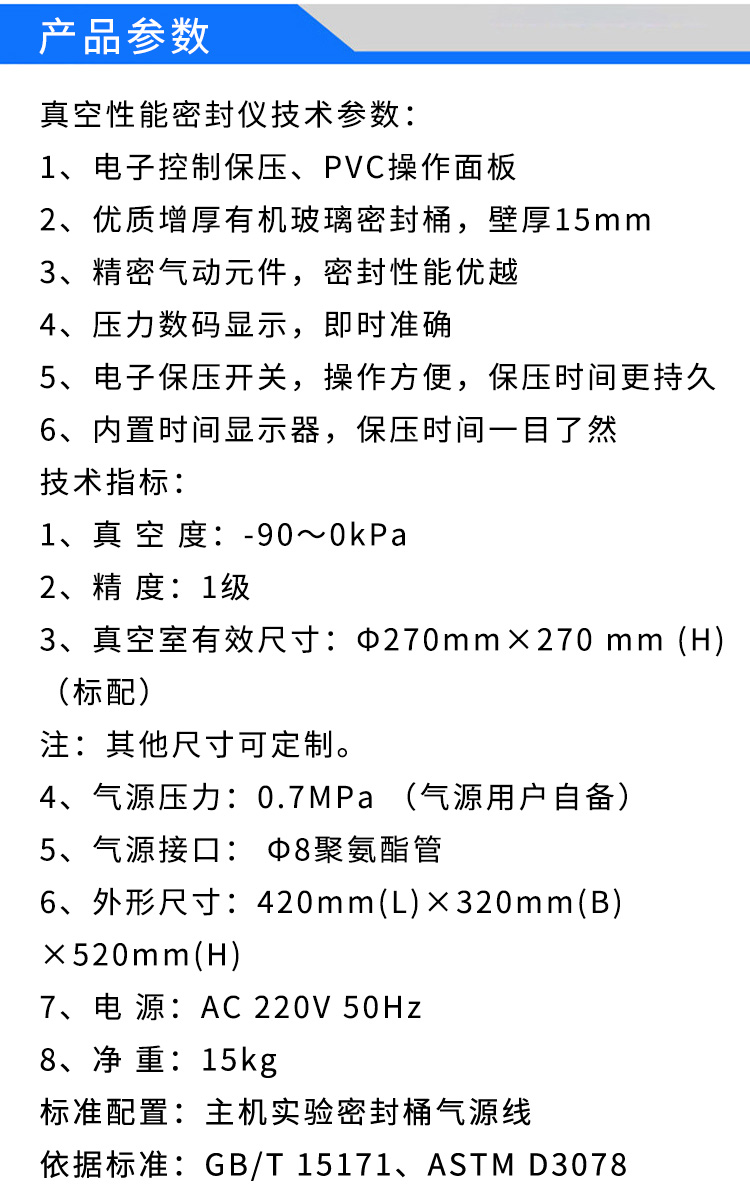 數顯真空密封性能測試儀用途和指標產品用途:適用于食品、制藥、醫療器械、日化、汽車、電子元器件、文具等行業的包裝袋、瓶、管、罐、盒等的密封試驗。亦可進行經跌落、耐壓試驗后的試件的密封性能測試測試原理:通過對真空室抽真空,使浸在水中的試樣產生內外壓差,觀測試樣內氣體外逸情況,以此判定試樣的密