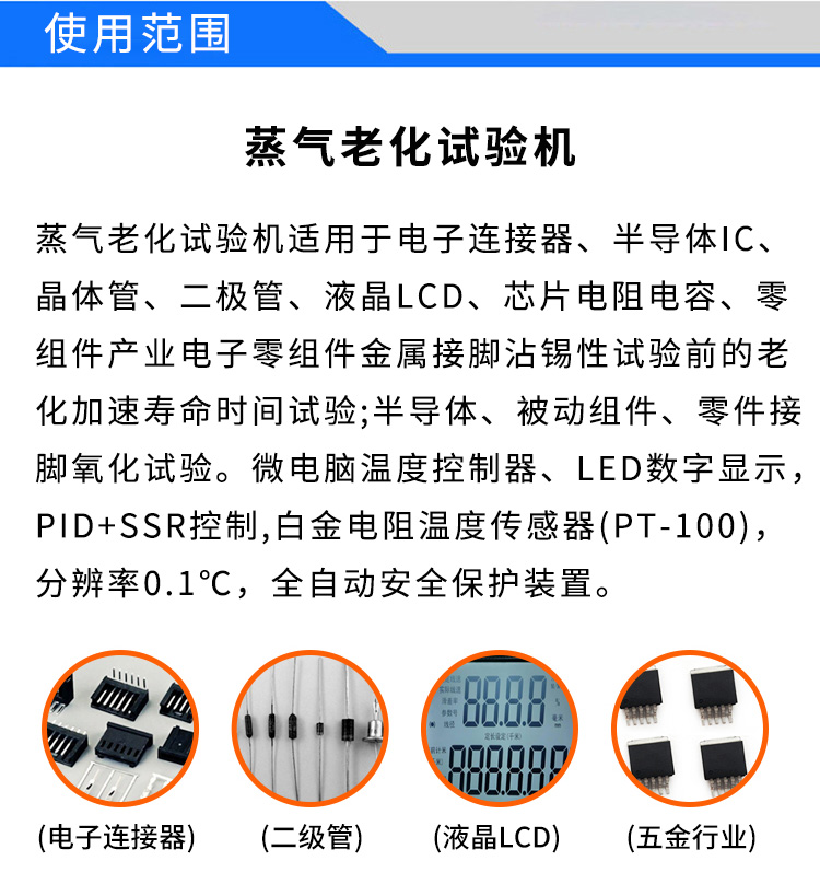 參數要求:1、內箱尺寸(W×H×D)㎜ 500×400×2002、外箱尺寸(W×H×D)㎜ 600×500×4203、蒸汽溫度(℃) Upto97℃4、控制器 PID微電腦控溫加熱方式 PID+SCR5、升溫時間 約45分鐘控制精度 ±0.5℃6、計時器 9999分電壓 220V 功率 2KW蒸氣老化試驗機特點:1、內、外箱體材質:SUS304不秀鋼制作。外觀美觀,不易老化2、水位控制