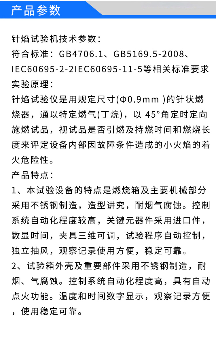 針焰試驗(yàn)機(jī) 烤漆款,符合標(biāo)準(zhǔn):GB4706.1、GB5169.5-2008、 IEC60695-2-2IEC60695-11-5等相關(guān)標(biāo)準(zhǔn)要求實(shí)驗(yàn)原理:針焰試驗(yàn)儀是用規(guī)定尺寸(Φ0.9mm )的針狀燃燒器,通以特定燃?xì)?丁烷),以 45°角定時(shí)定向施燃試品,視試品是否引燃及持燃時(shí)間和燃燒長(zhǎng)度來評(píng)定設(shè)備內(nèi)部因故障條件造成的小火焰的著火危險(xiǎn)性。產(chǎn)品特點(diǎn):1、
